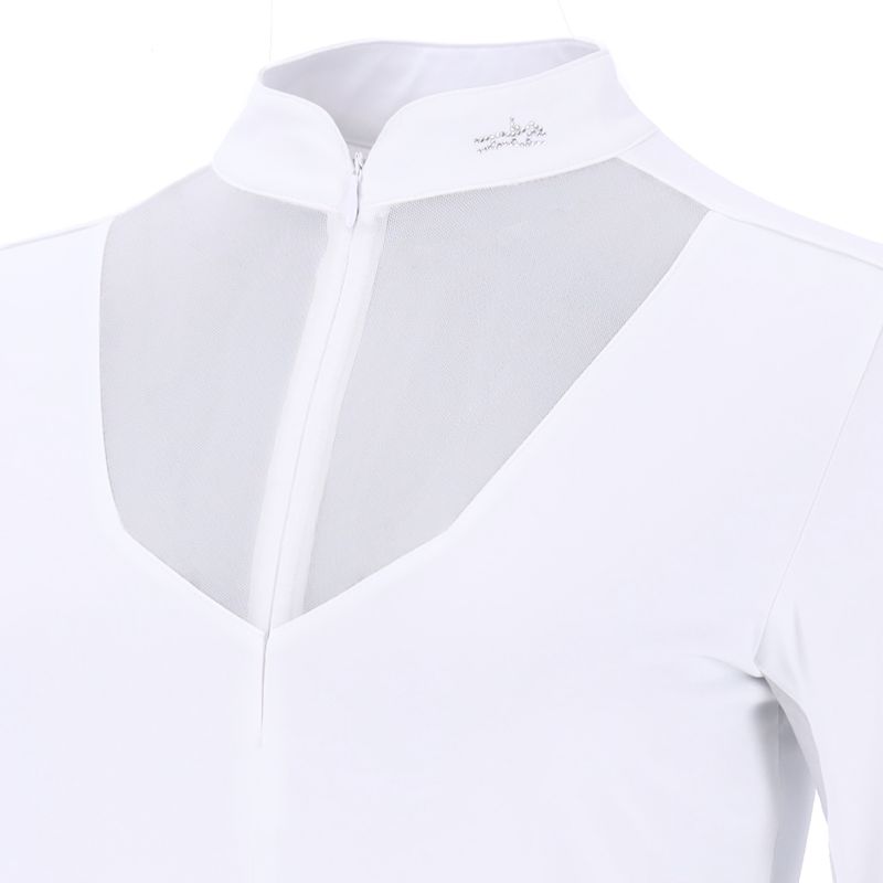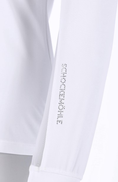 De lange mouwen met manchetten zorgen voor een comfortabele pasvorm, terwijl de transparante mesh-inzet aan de voorkant en onder de arm extra ventilatie biedt.